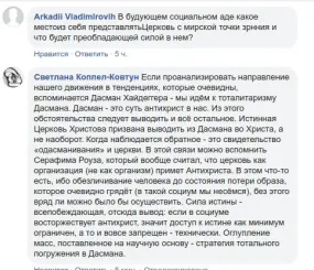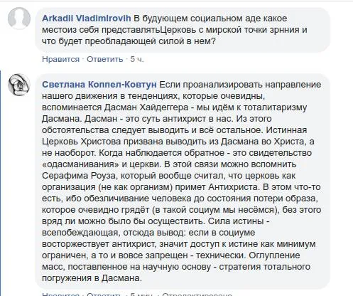 Мой ответ: Если проанализировать направление нашего движения в тенденциях, которые очевидны, вспоминается Дасман Хайдеггера - мы идём к тоталитаризму Дасмана. Дасман - это суть антихрист в нас. Из этого обстоятельства следует выводить и всё остальное. Истинная Церковь Христова призвана выводить из Дасмана во Христа, а не наоборот. Когда наблюдается обратное - это свидетельство «одасманивания» и церкви. В этой связи можно вспомнить Серафима Роуза, который вообще считал, что церковь как организация (не как организм) примет Антихриста. В этом что-то есть, ибо обезличивание человека до состояния потери образа, которое очевидно грядёт (в такой социум мы несёмся), без этого вряд ли можно было бы осуществить. Сила истины - всепобеждающая, отсюда вывод: если в социуме восторжествует антихрист, значит доступ к истине как минимум ограничен, а то и вовсе запрещен - технически. Оглупление масс, поставленное на научную основу - стратегия тотального погружения в Дасмана.