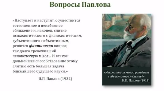 Павлова интересовало то же самое, что и нас сегодня, несмотря на, может быть, другие подходы. В его знаменитой Нобелевской речи, он заканчивает её знаменитыми словами, что в сущности человека интересует его собственное психическое содержание*. И вопрос этот оставался и остаётся погружённым в тьму. И все ресурсы человечества (искусство, религия, философия, литература, история) направлены на поиски того, как пролить свет на эту тьму. Но есть ещё другой ресурс - это естественные науки.
