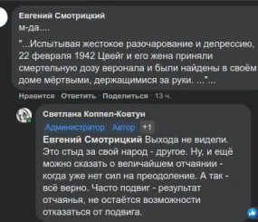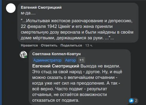 «...Испытывая жестокое разочарование и депрессию, 22 февраля 1942 Цвейг и его жена приняли смертельную дозу веронала и были найдены в своём доме мёртвыми, держащимися за руки...»