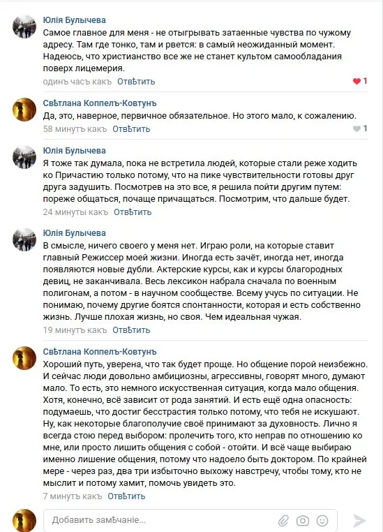 Мне кажется, что нет сил быть такой, как велит совесть. Потому отпуск был необходим, чтобы отсекать всё, что ранит, травмирует, пока ранки зарубцуются. Но совесть запела раньше, чем я надеялась. Я с ней немножко пыталась спорить - недолго, хотя инерция спора ещё протянется. Сил-то нет... Но пора идти дальше, судя по всему.