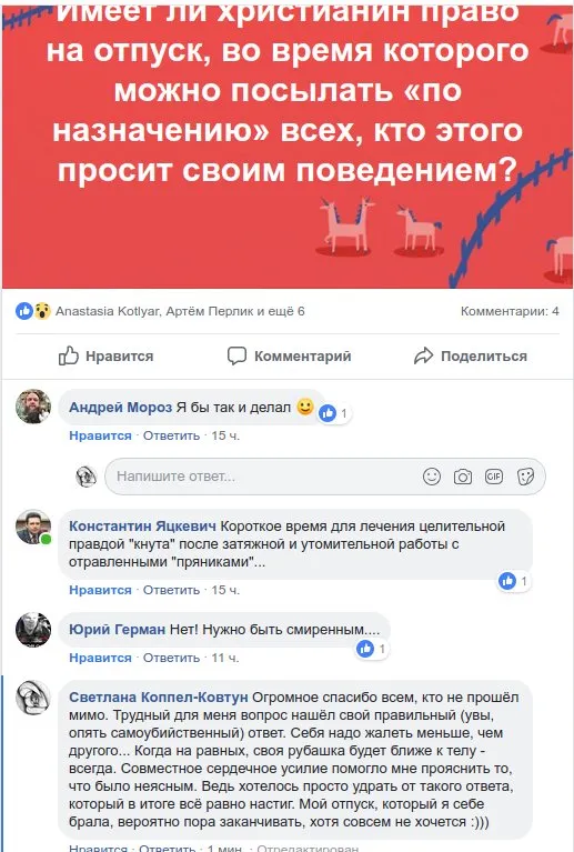 Проблема в том, что совесть меня в отпуск не отпускает: я хочу одного, а совесть - другого. Она требует, чтобы я каждому дала максимум возможного для того, чтобы он понял в чём он неправ.