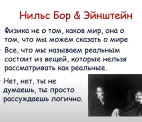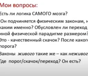 Мозг физический объект? Физический. У него есть вес там... Он подчиняется законам физики? Мы не знаем. А если подчиняется, то какой физике? Ньютону он подчиняется или может Планку, или Нильсу Бору... Он кому подчиняется? Или когда природа переходит на живое, там начинают действовать и другие законы тоже? Это серьёзный вопрос.