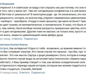 Люблю ли я советскую эстраду? - спрашивают. Сказать «люблю» равно как и «не люблю» - неправда. Как же ответить? Пожалуй самой верной будет такая формулировка: я люблю музыку про меня. Так же я люблю книги про меня, фильмы про меня.... Всё, что затрагивает меня тем или иным образом. Но не вообще, а именно в том измерении, в той точке, где я живу наиболее интенсивно. И в этом смысле советская эстрада скорее не про меня - иное было время, люди, иные вызовы, задачи и проблемы, иной ритм, иная цветовая гамма, иные границы...