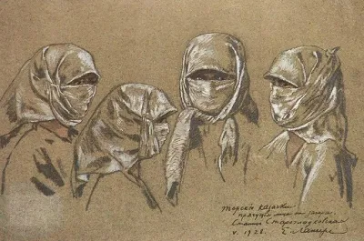 «Для сохранения кожи лица и рук от загара они и в поле, и садах, а так же дома, «кутаются», обвязывая лицо платком настолько, что оставляют видными только одни жгучие глаза».