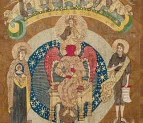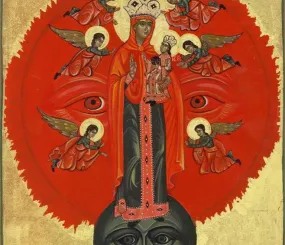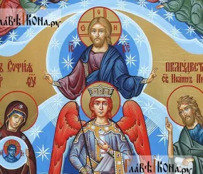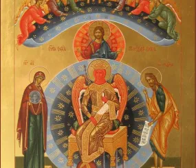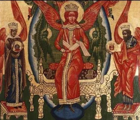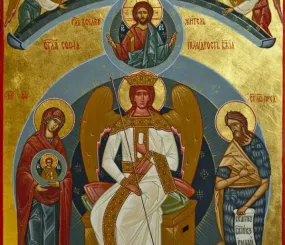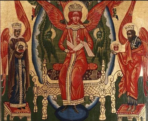 Вот София в красном. Почему? В иконописи красный цвет - цвет мученичества, то есть она тут, вероятно, в красном - как страдалица нашими пороками и грехами. Она ведь с нами едина.