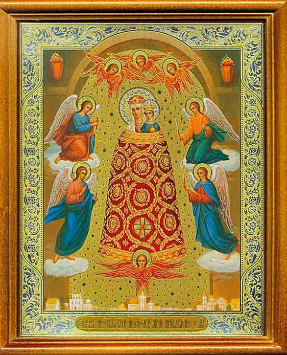 О, Пресла́вная Ма́ти Христа́ Бо́га на́шего, благи́х Пода́теля, ми́лостию Свое́ю всю вселе́нную сохрани́, да́руй нам, рабо́м Твои́м, прему́дрость и ра́зум, све́том Сы́на Твоего́ ду́ши на́ша просвети́, еди́на Всепе́тая, от Херуви́м и Серафи́м сла́вимая.