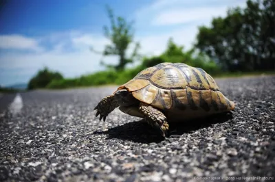 Теперь идти было легче, и за работу принялись все четыре ноги; панцирь двигался вперед, покачиваясь из стороны в сторону. На шоссе показалась машина, за рулем которой сидела пожилая женщина. Она заметила черепаху и круто свернула вправо. Шины взвизгнули, подняв облако пыли. Два колеса на секунду оторвались от земли и тут же стали обратно. Машина пошла дальше, но уже гораздо медленнее. Черепаха, спрятавшая было голову и ноги, теперь заторопилась, потому что раскаленный бетон обжигал се, точно огнем.