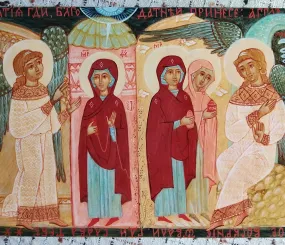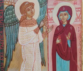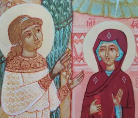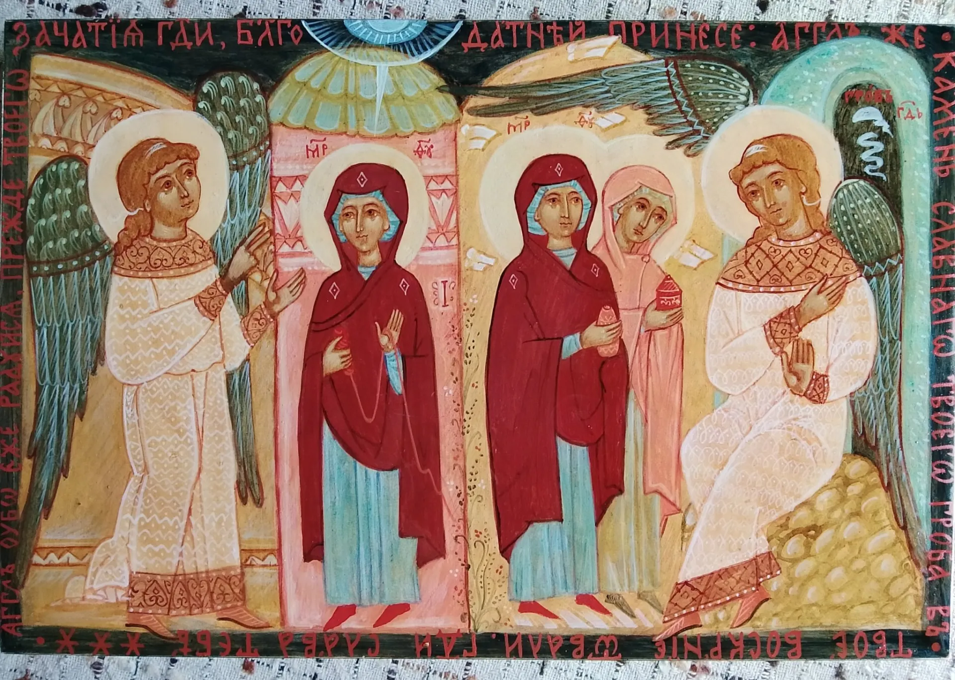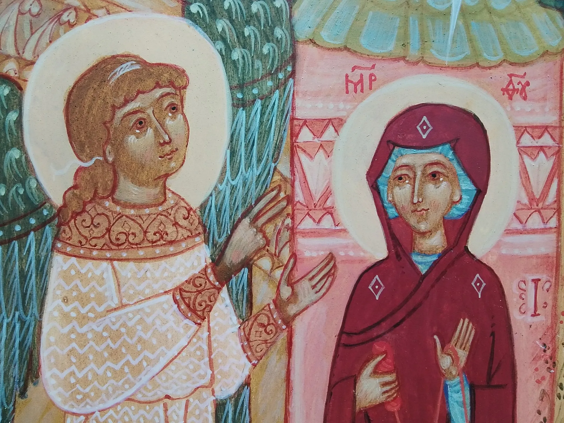 Икона на воскресную стихиру 2 гласа: "Ангел убо еже радуйся, / прежде Твоего зачатия Господи, Благодатней принесе: / Ангел же камень славнаго Твоего гроба / в Твое Воскресение отвали: / ов убо в печали место, / веселия образы возвещая: / сей же в смерти место, / Владыку Жизнодавца проповедуя нам, / темже вопием Ти: / Благодетелю всех, Господи слава Тебе".