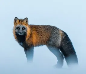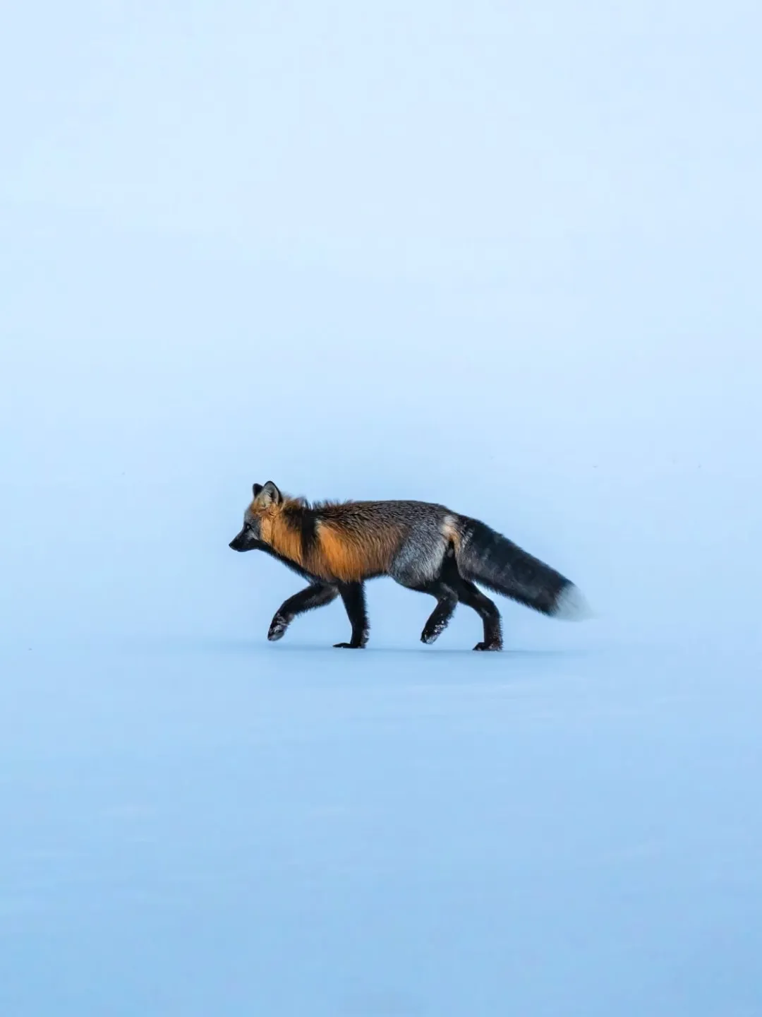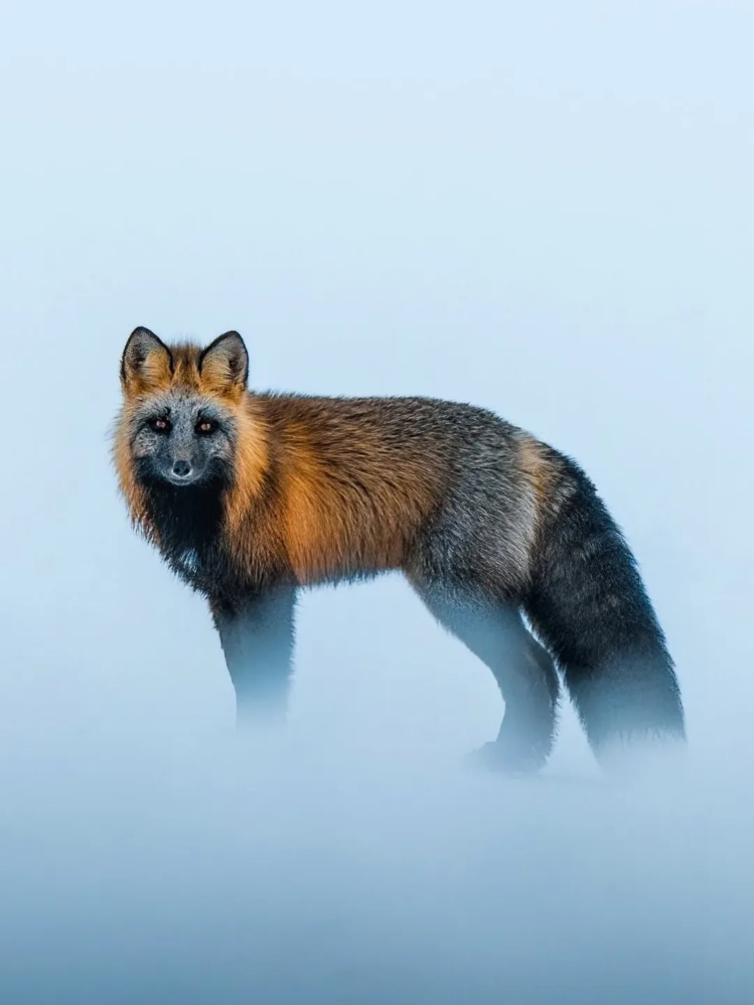 Сочетание огненно-рыжего меха с глубокими угольно-черными и серебристыми оттенками создает невероятную палитру. На фоне бесконечного белого снега и холодного тумана Ньюфаундленда лиса кажется живым пламенем среди льдов.