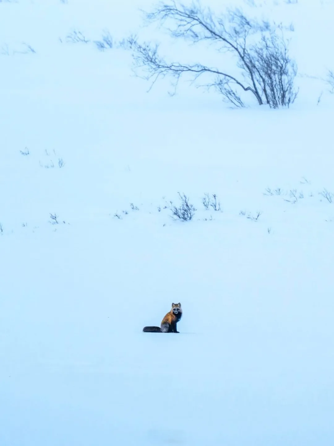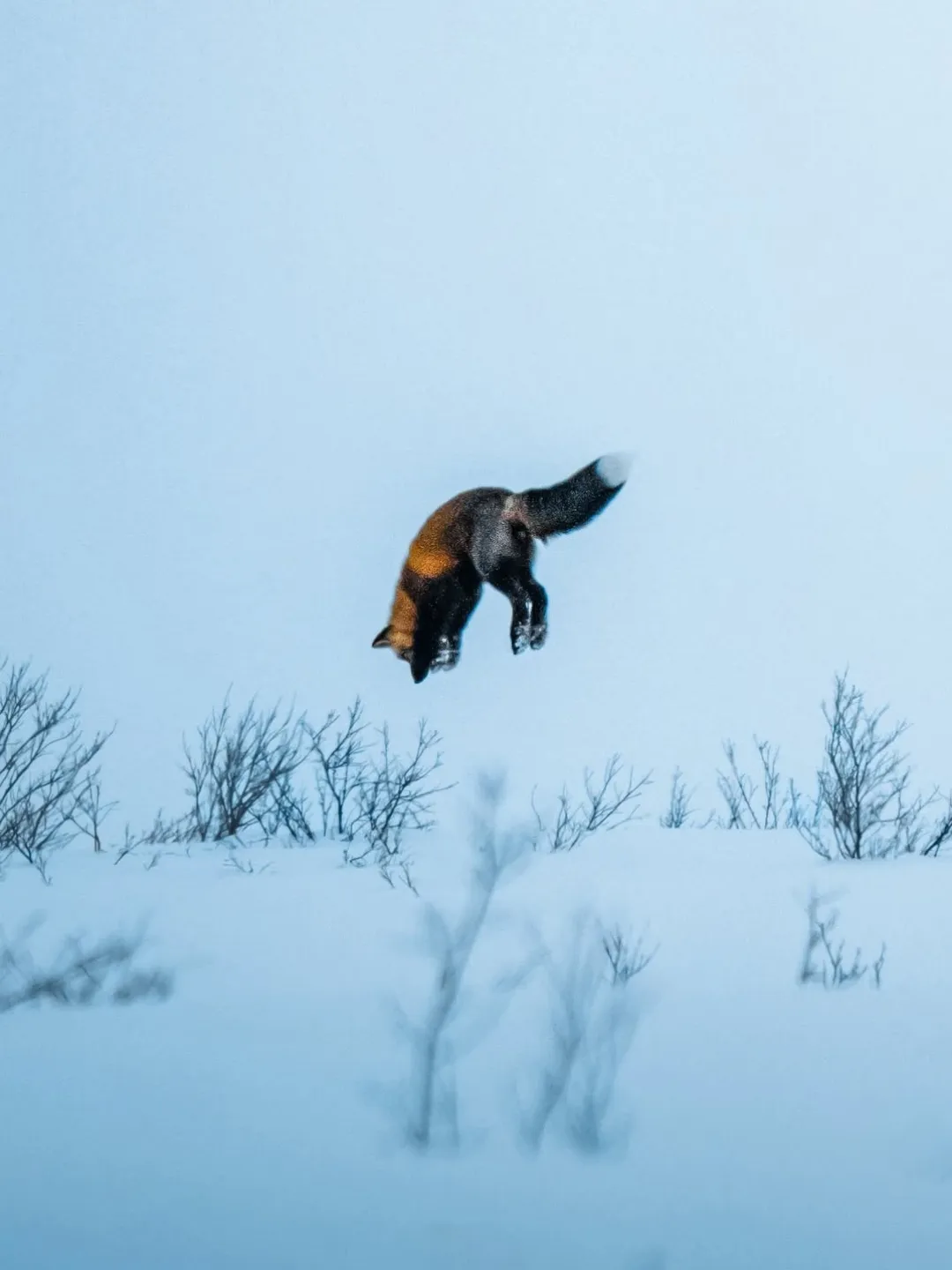 На этих кадрах — не мифическое существо, а редкая жемчужина северной природы. Перед нами лиса-крестовка, необычная цветовая вариация рыжей лисицы. Свое название она получила из-за темного узора на спине, который при взгляде сверху образует очертания креста. Но здесь, в объективе Дасти Кресси, она выглядит скорее как персонаж из древней легенды.
