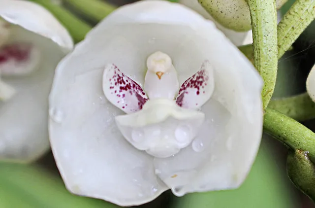 Заглядывая в зев цветка, мы сталкиваемся с миниатюрной фигуркой белого голубя – так сложила природа лепестки, пестики и тычинки для этой представительницы Орхидных.