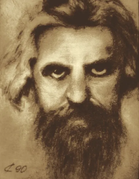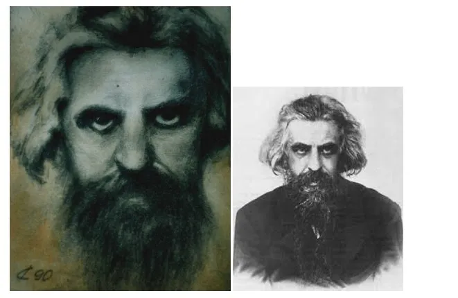 История создания такова. В доме была книжечка Соловьева, в которой был размещён портрет философа (не самый удачный), с которого и был срисован данный портрет.