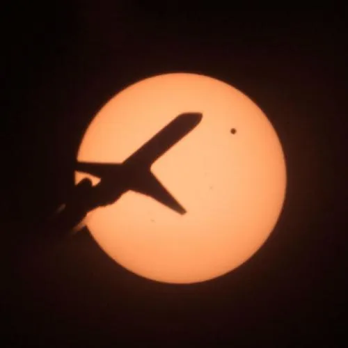 2. Самолет на фоне Солнца, на фоне которого видна Венера. Снимок сделан в Калифорнии.