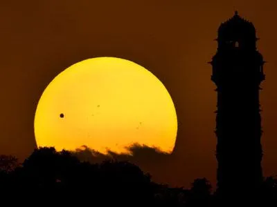 3. Планета Венера видна в виде крохотной черной точки на солнечном диске, 6 июня 2012 года. Также видна башня в Читторгархе, Индия.