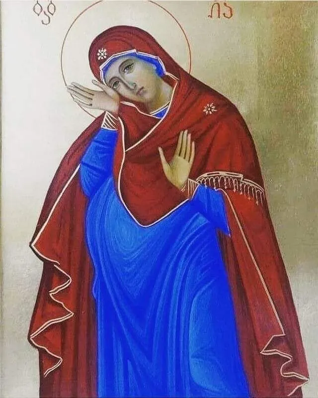 Эта икона беременной Божией Матери была найдена в одном из женских монастырей западной Грузии. При ремонте был поднят пол, под которым оказалось хранилище ряда уникальных икон. Среди прочих была обнаружена и эта икона Марии, носящей во чреве Христа.