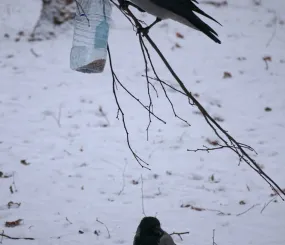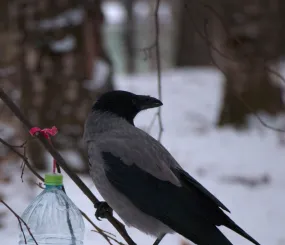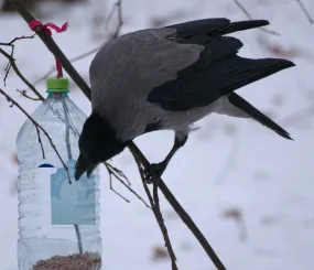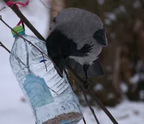 Отверстие в бутылке-кормушке маленькое (для мелких птичек), потому ворона переворачивает её, вытряхивая зёрна на снег. Другая ворона тем временем насыщается.